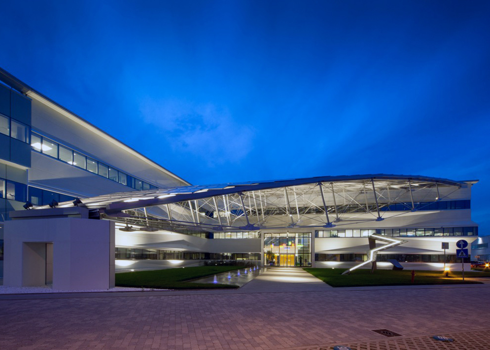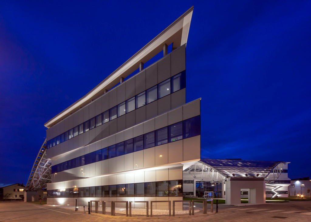 Il progetto per la sede Arval riprende la forma di una saetta, alludendo alla scelta di sfruttare energia pulita. A livello compositivo, la linearità dei prospetti con vetrate a nastro alternate a fasce rivestite da pannelli bianchi è animata dalle finestrature. Gli interni, che ospitano uffici e spazi comuni, beneficiano di un elevato apporto di luce naturale che garantisce il comfort negli spazi di lavoro.
