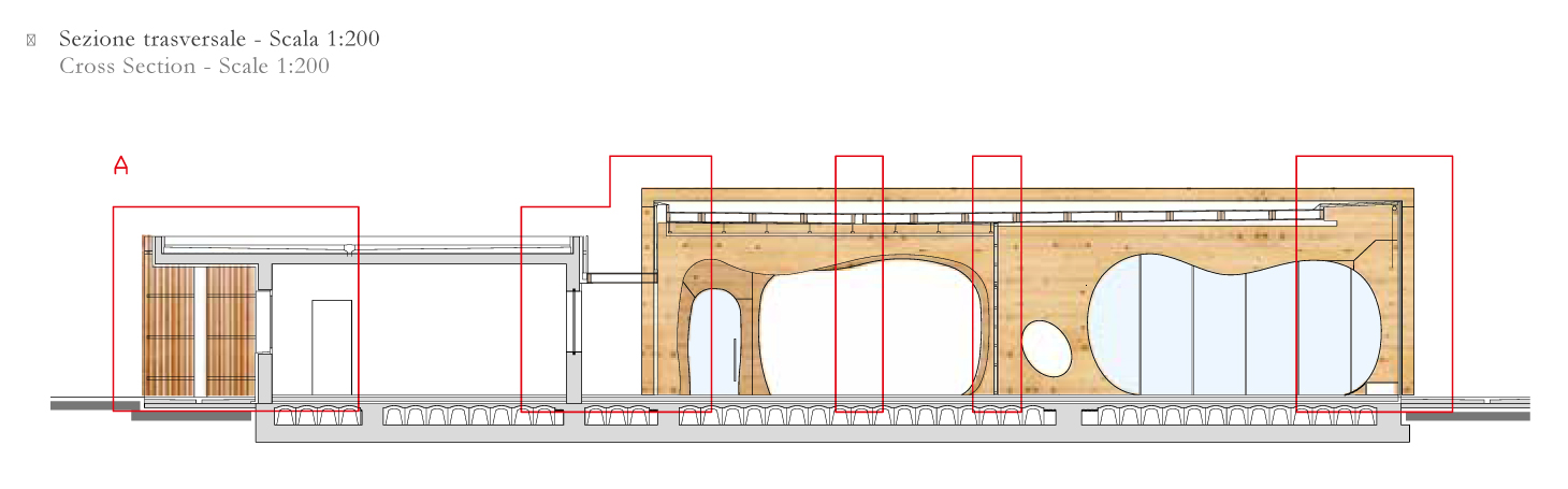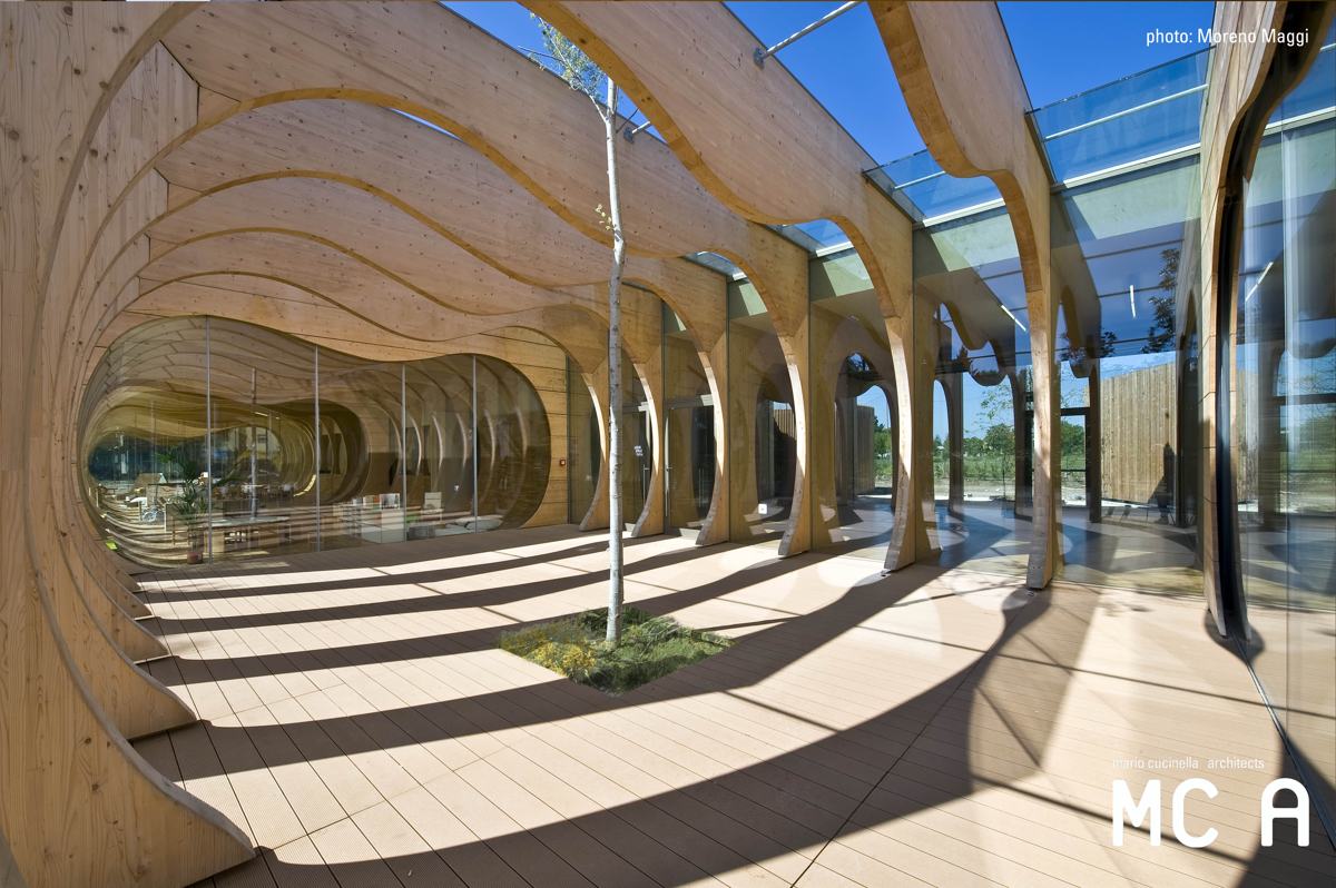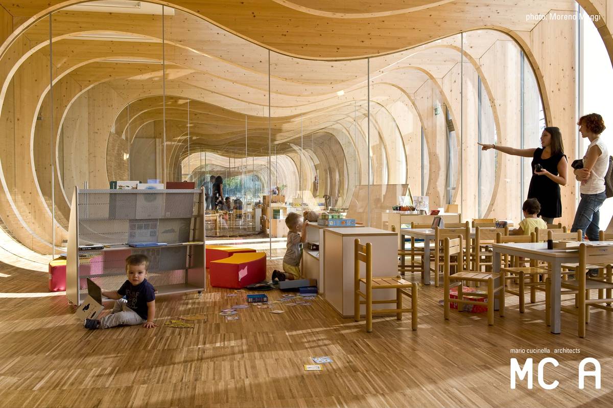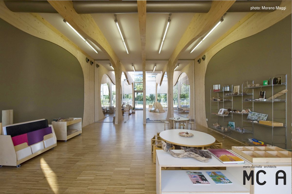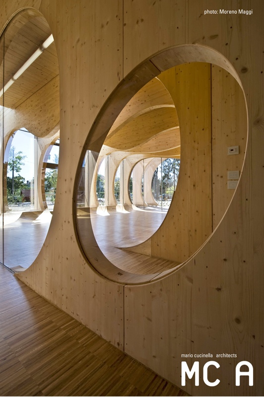 "In funzione della particolare destinazione d’uso, le linee morbide e arrotondate della struttura lignea dell’edificio ispirano protezione e calore, in un dialogo ininterrotto tra interno ed esterno."