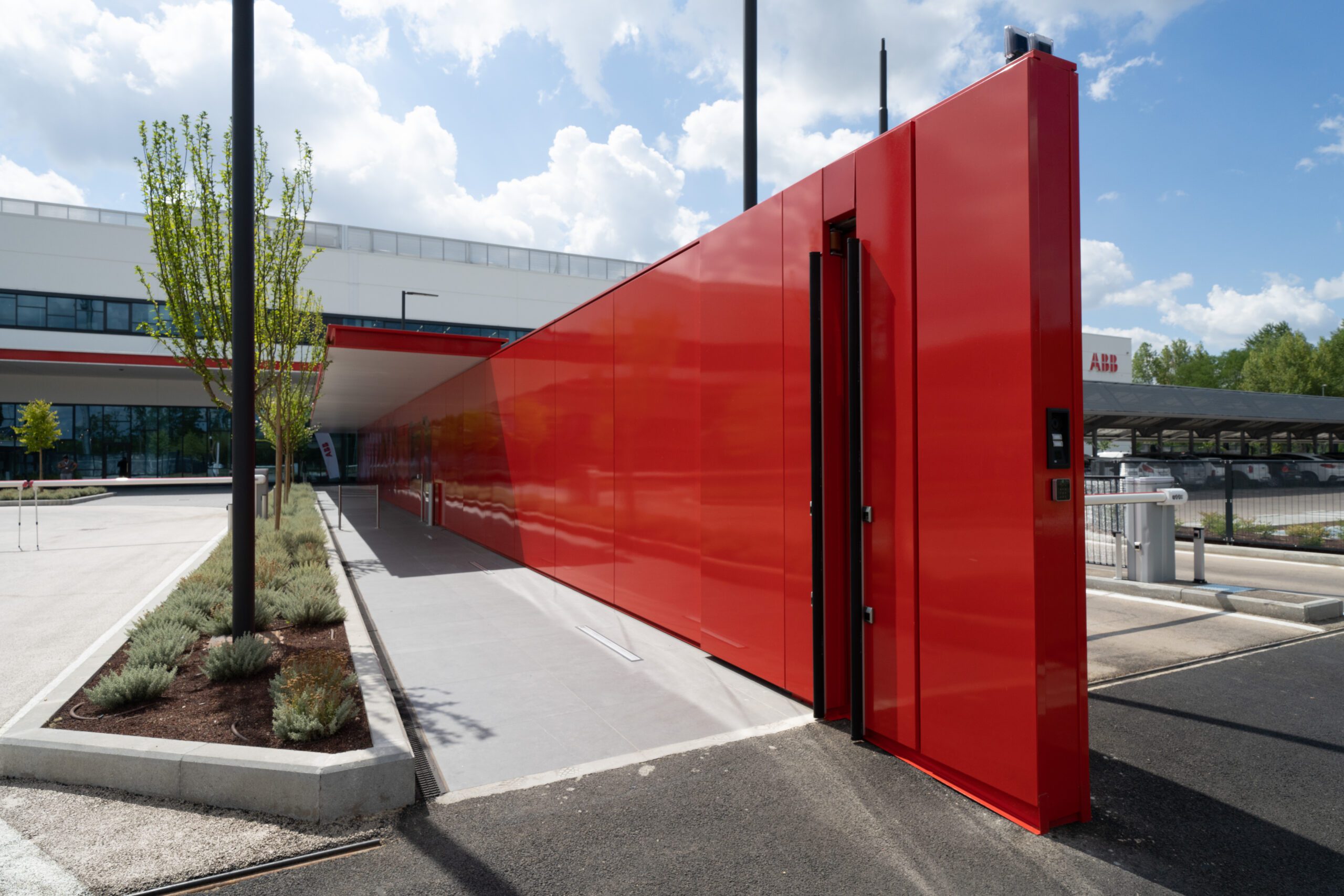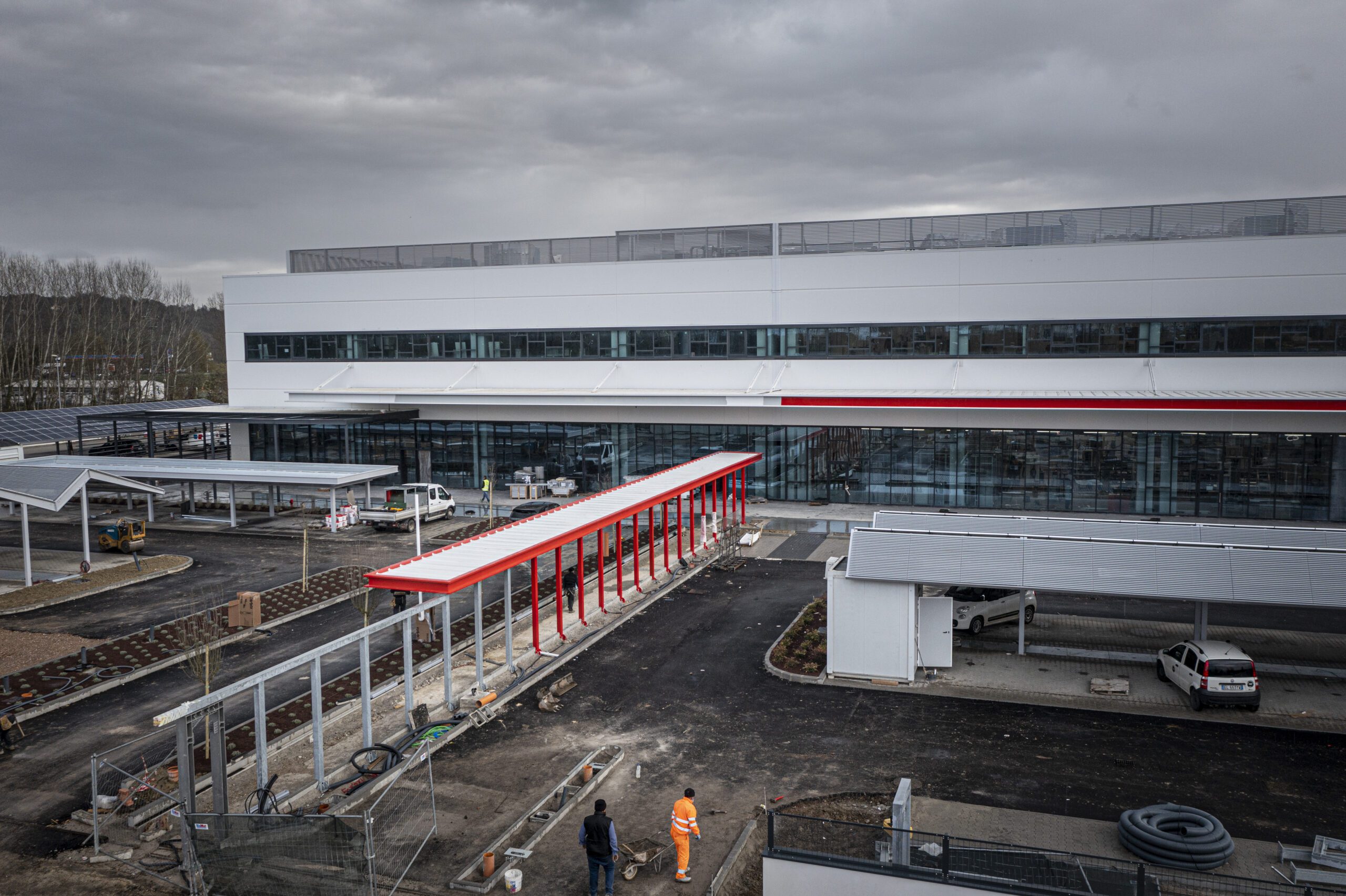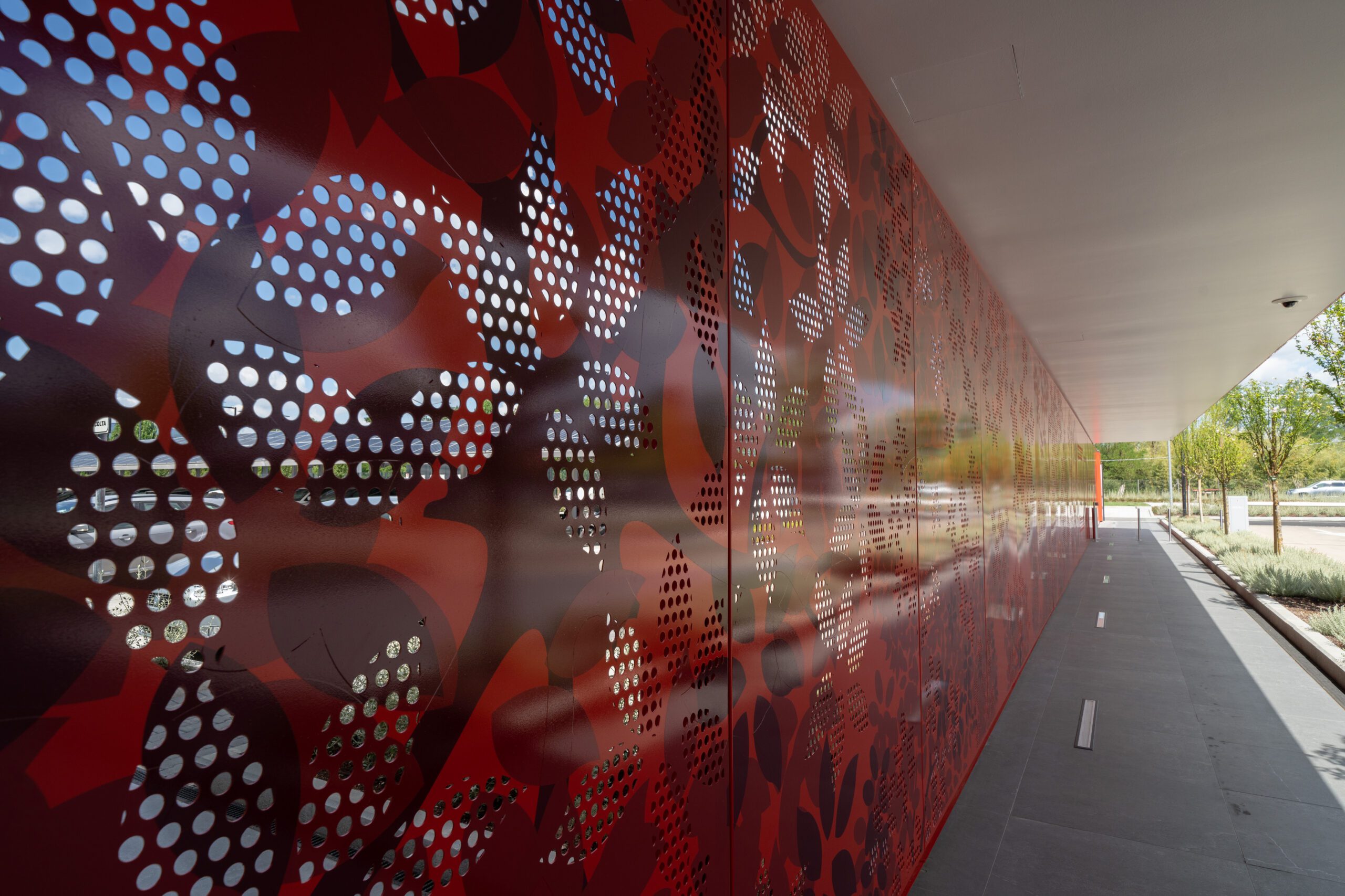 L’intervento di Promo Spa ha riguardato i tamponamenti con pannelli di alluminio, le chiusure delle vetrate con profili di facciata continua e infissi Schüco, le pensiline in carpenteria metallica predisposte per la copertura fotovoltaica, il percorso di ingresso realizzato con lamiera decorata al laser, le pareti divisorie interne e le schermature esterne.