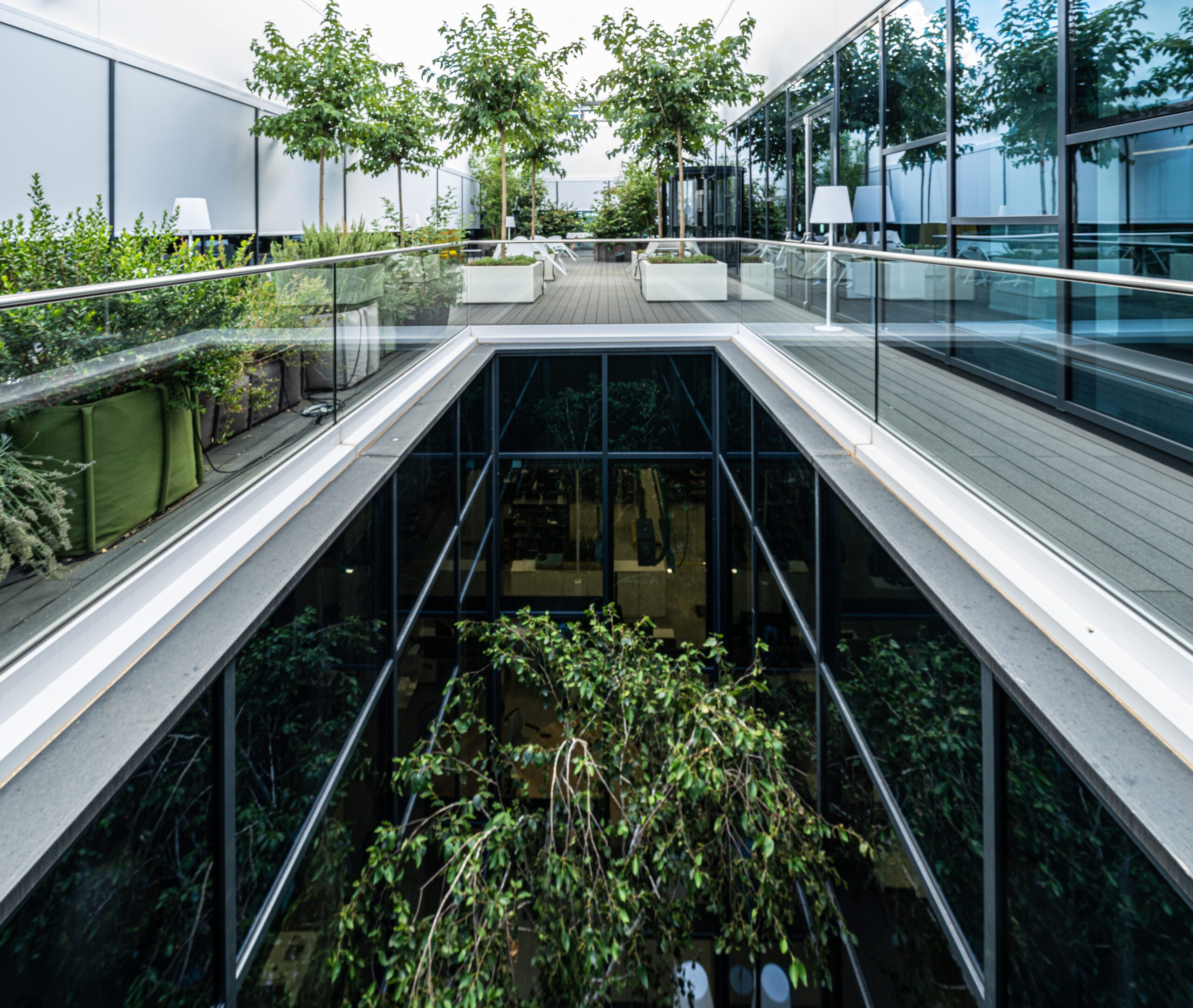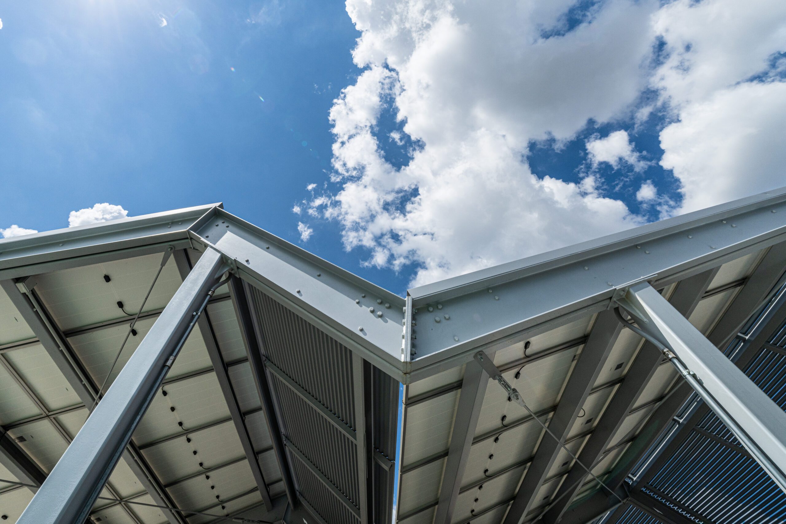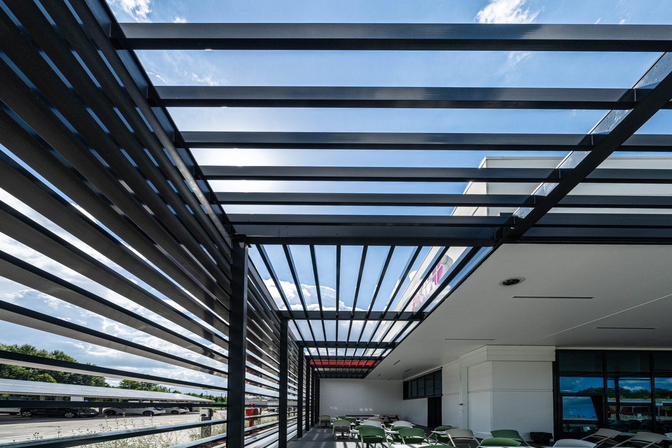 L’intervento di Promo Spa ha riguardato i tamponamenti con pannelli di alluminio, le chiusure delle vetrate con profili di facciata continua e infissi Schüco, le pensiline in carpenteria metallica predisposte per la copertura fotovoltaica, il percorso di ingresso realizzato con lamiera decorata al laser, le pareti divisorie interne e le schermature esterne.