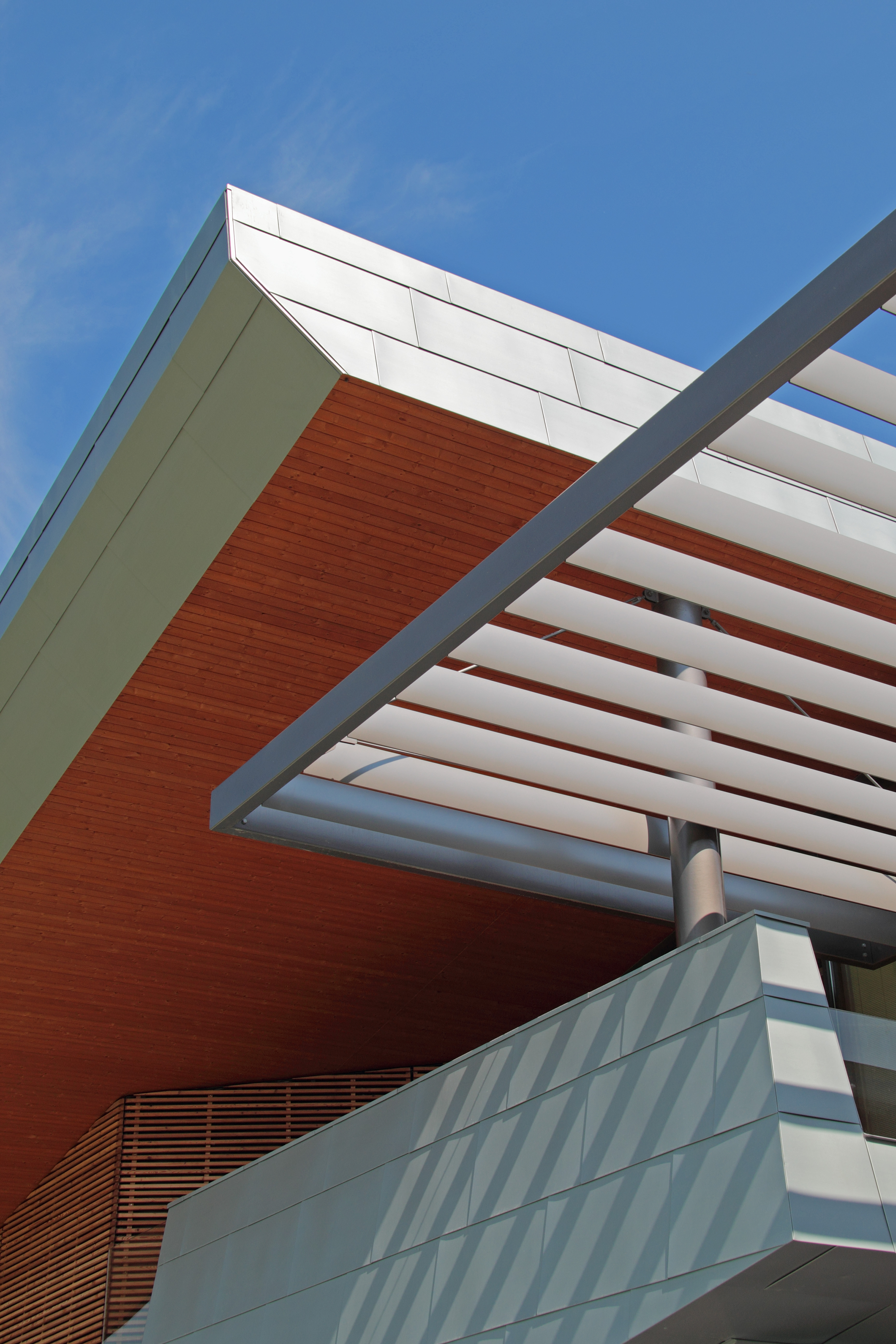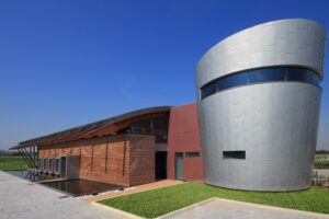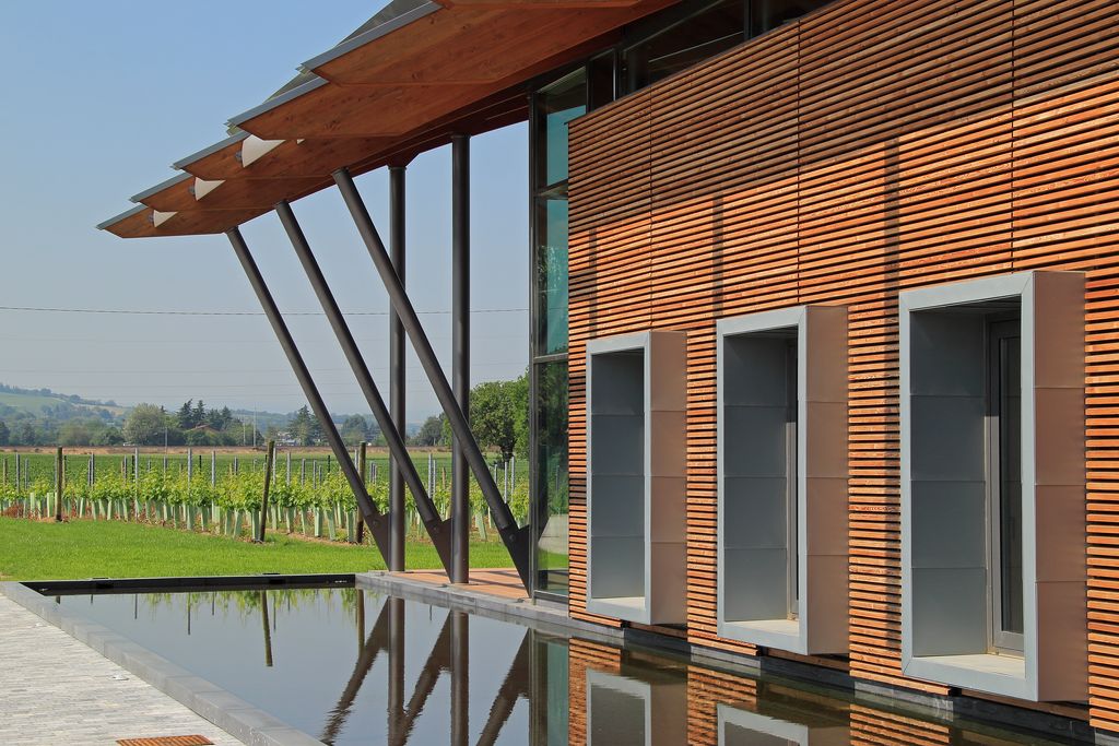 La sede di Cantine Sgarzi Luigi è stata progettata per integrarsi al paesaggio. I profili dei volumi del complesso architettonico, immerso nei vigneti, riducono l’impatto del costruito, mentre i rivestimenti in larice rievocano l’essenza delle barrique.