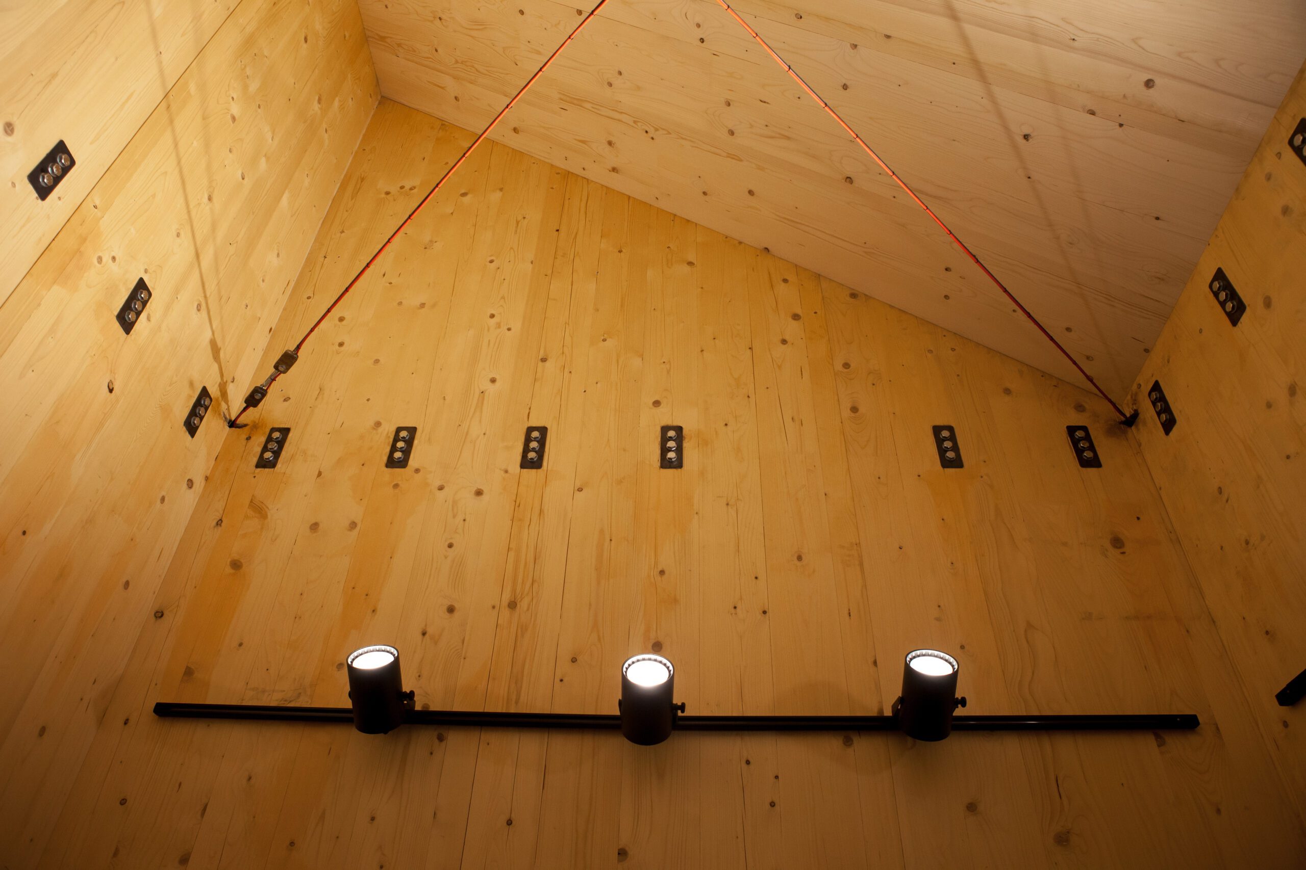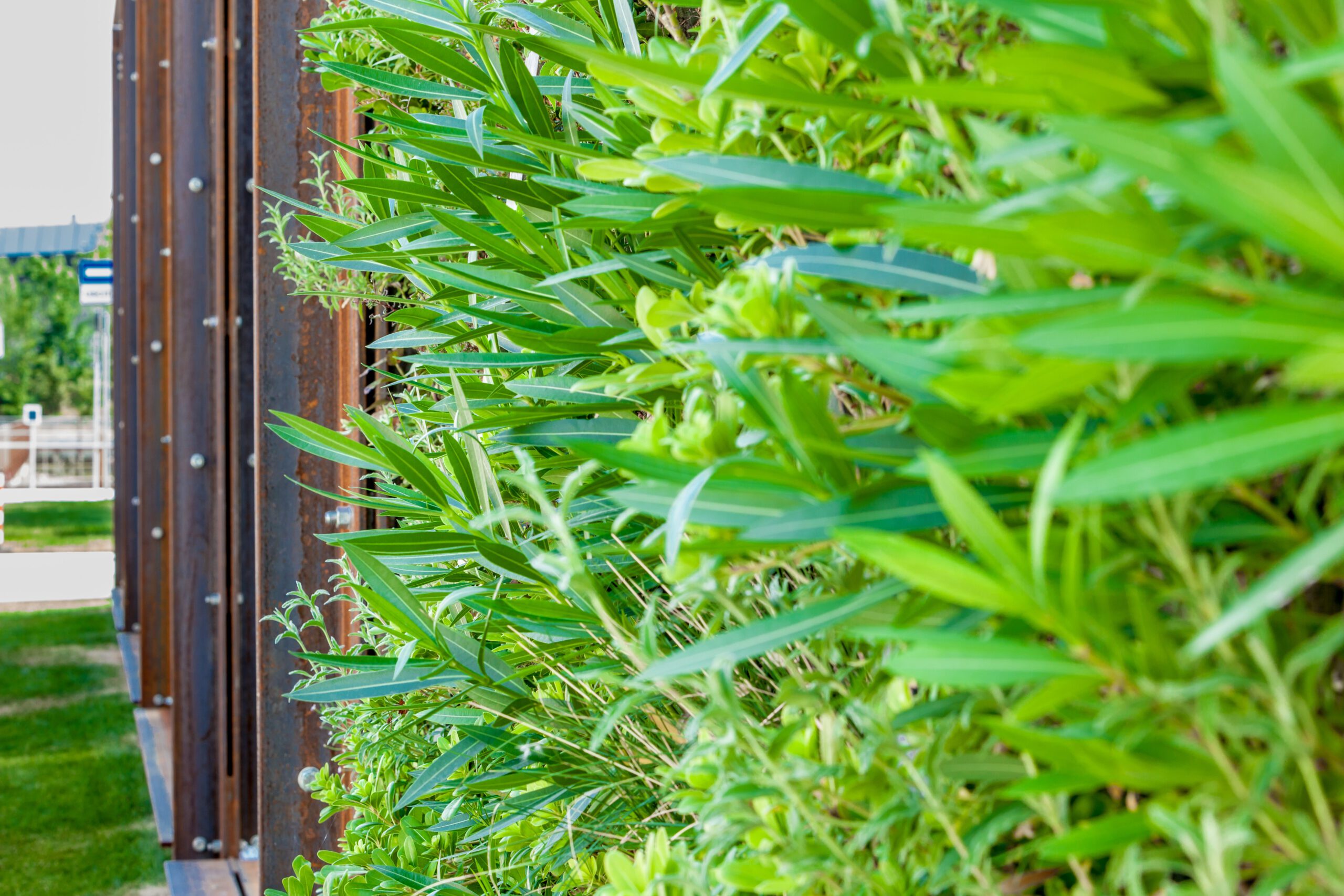 La maglia strutturale in profili di acciaio imbullonati accoglie i volumi realizzati con pannelli portanti in legno, alternando porzioni di facciata riflettenti ad altre rivestite da conci regolari di sughero o dalla vegetazione. Per l’intero padiglione sono stati utilizzati 65 metri cubi di legno italiano di varia provenienza.