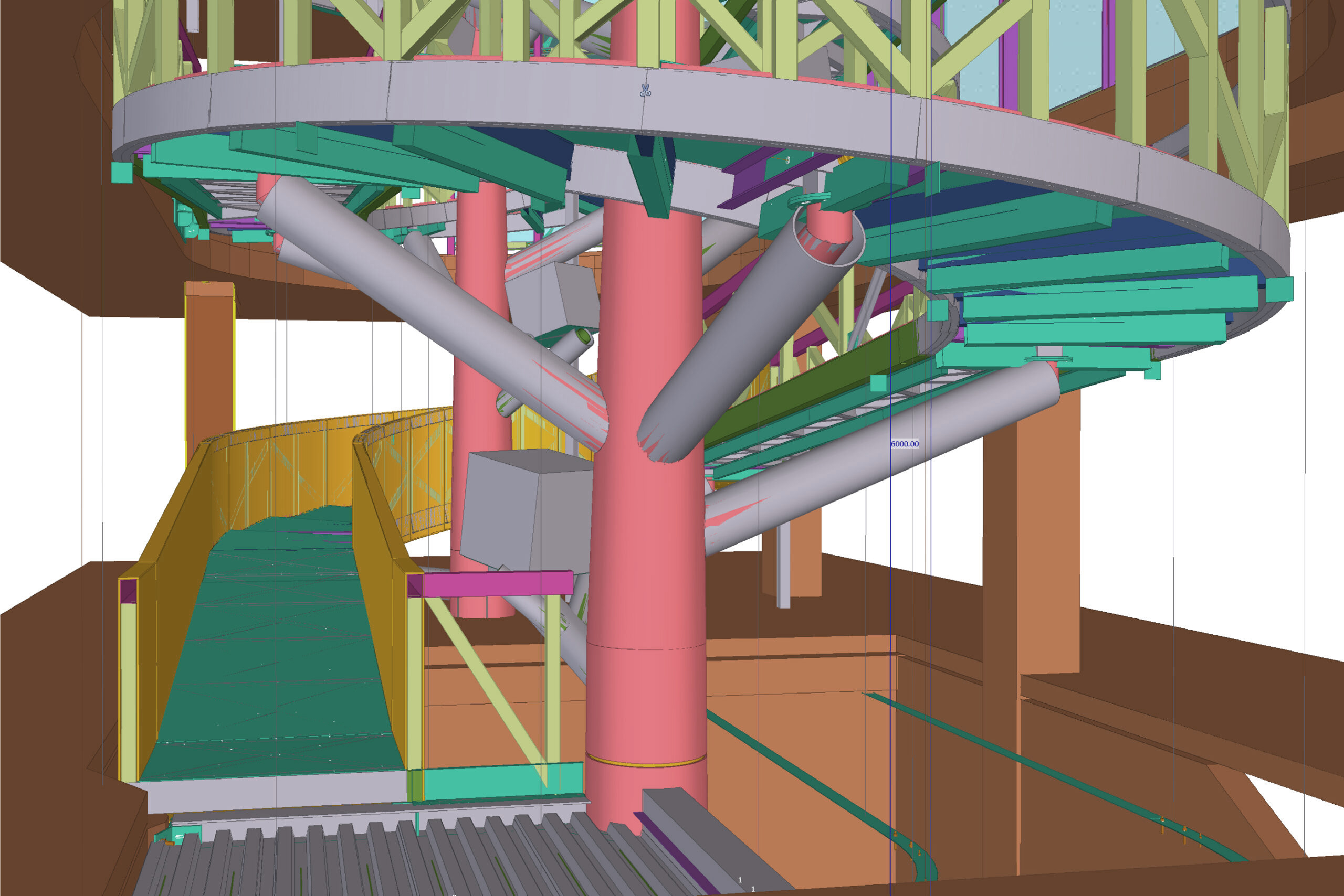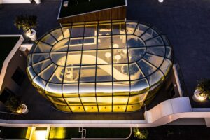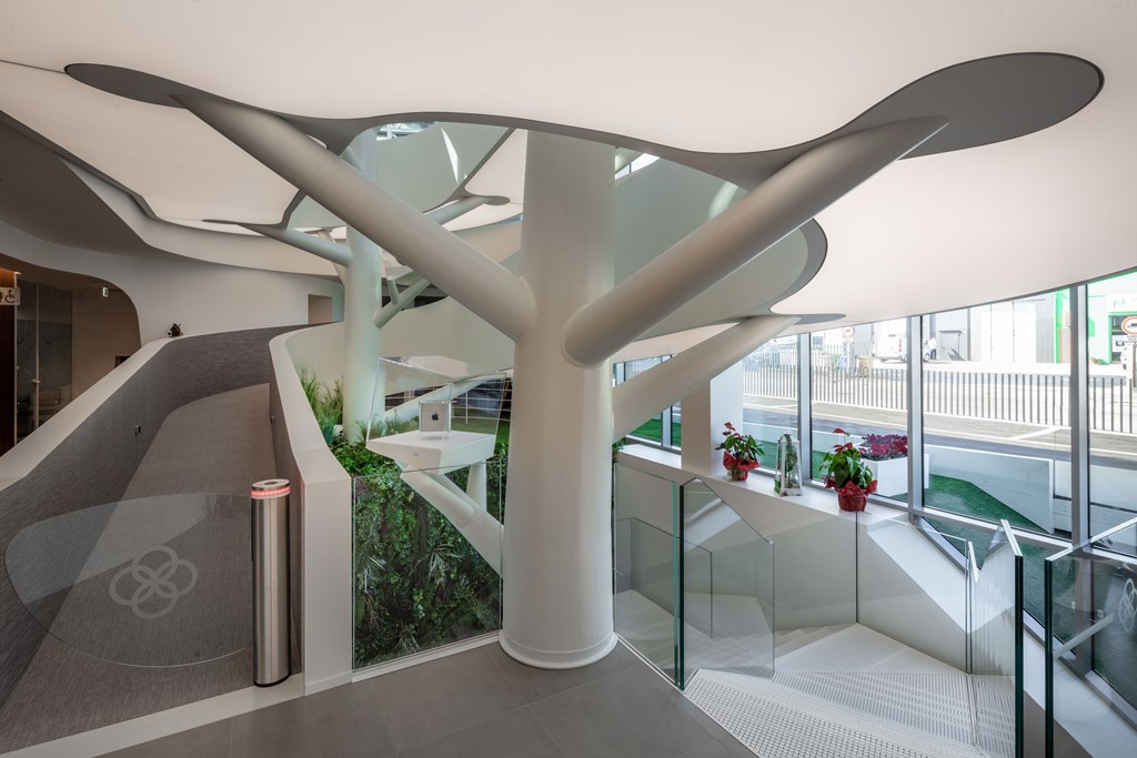 Il complesso si caratterizza per la struttura della rampa di accesso metallica e per la copertura, una sfida sotto il profilo architettonico, geometrico, strutturale e costruttivo. Per la realizzazione dei pilastri che sostengono la rampa, la cui forma organica ricorda quella degli alberi, sono stati utilizzati elementi tronco-conici ottenuti mediante la calandratura di una lamiera spessa 10 mm, successivamente saldata in senso longitudinale. L’ingegnerizzazione di questi elementi ha permesso di mantenerne l’aspetto irregolare rispettando normative ed esigenze strutturali. La copertura dell’edificio è una grande